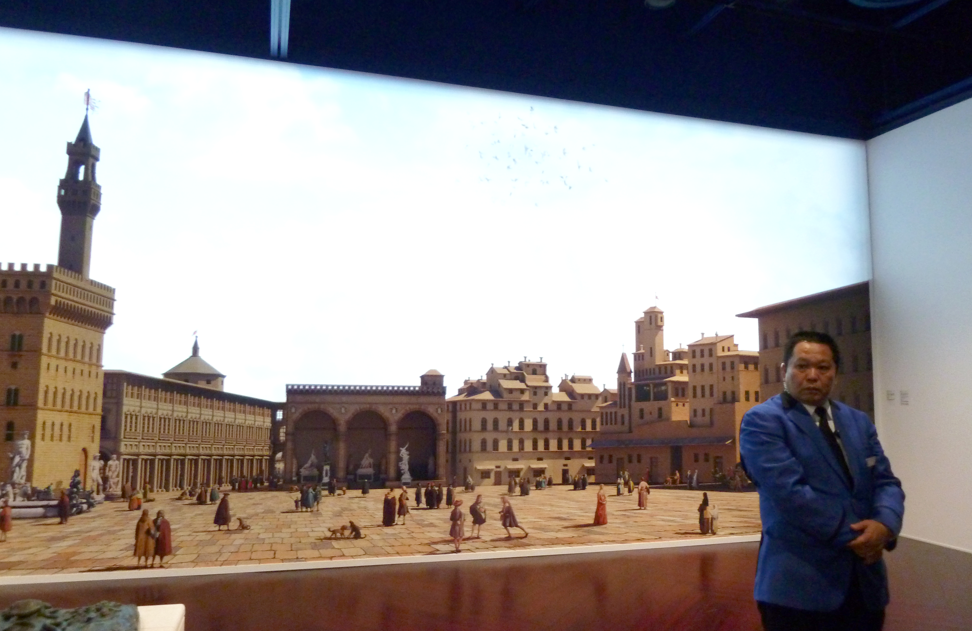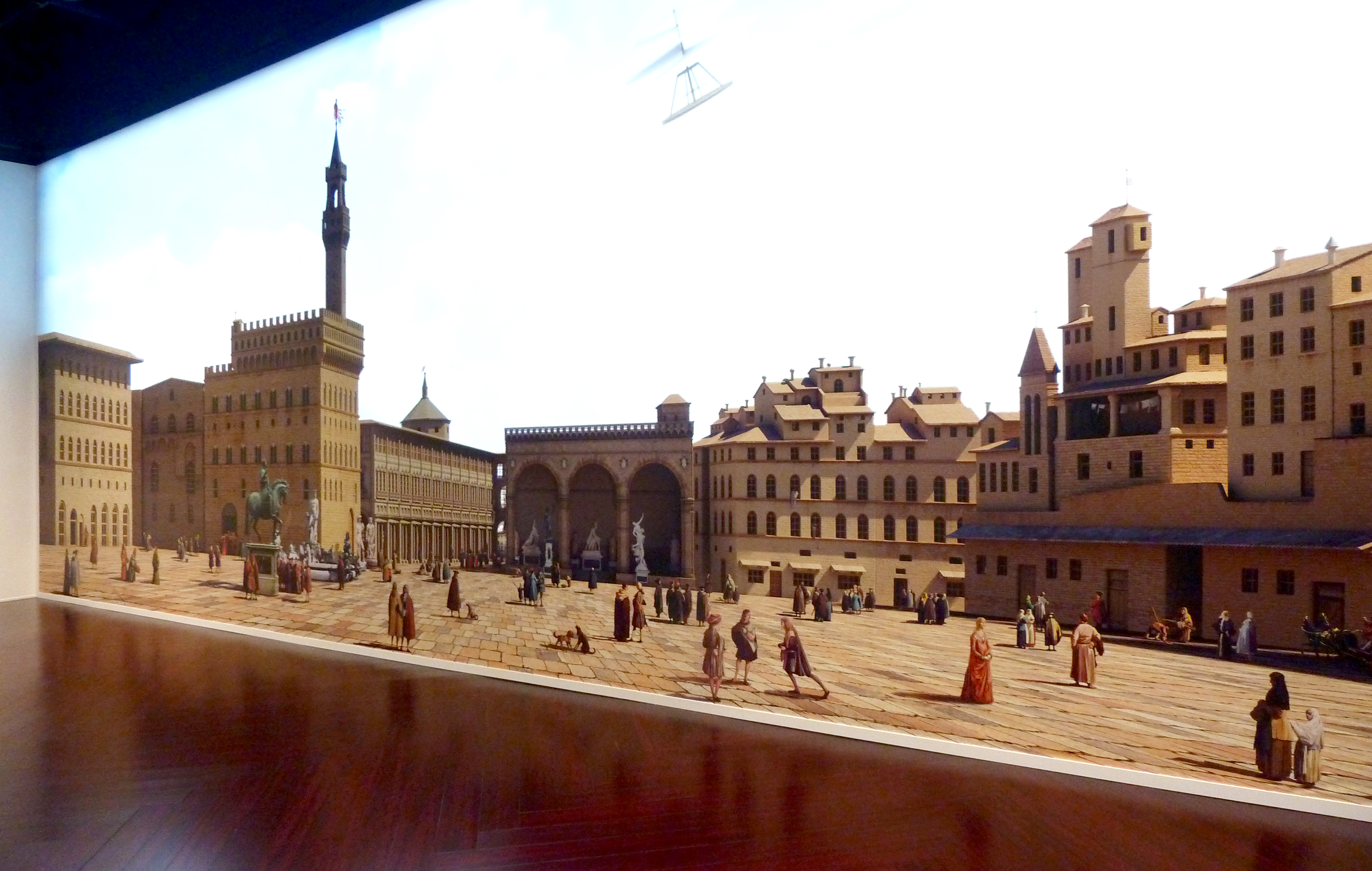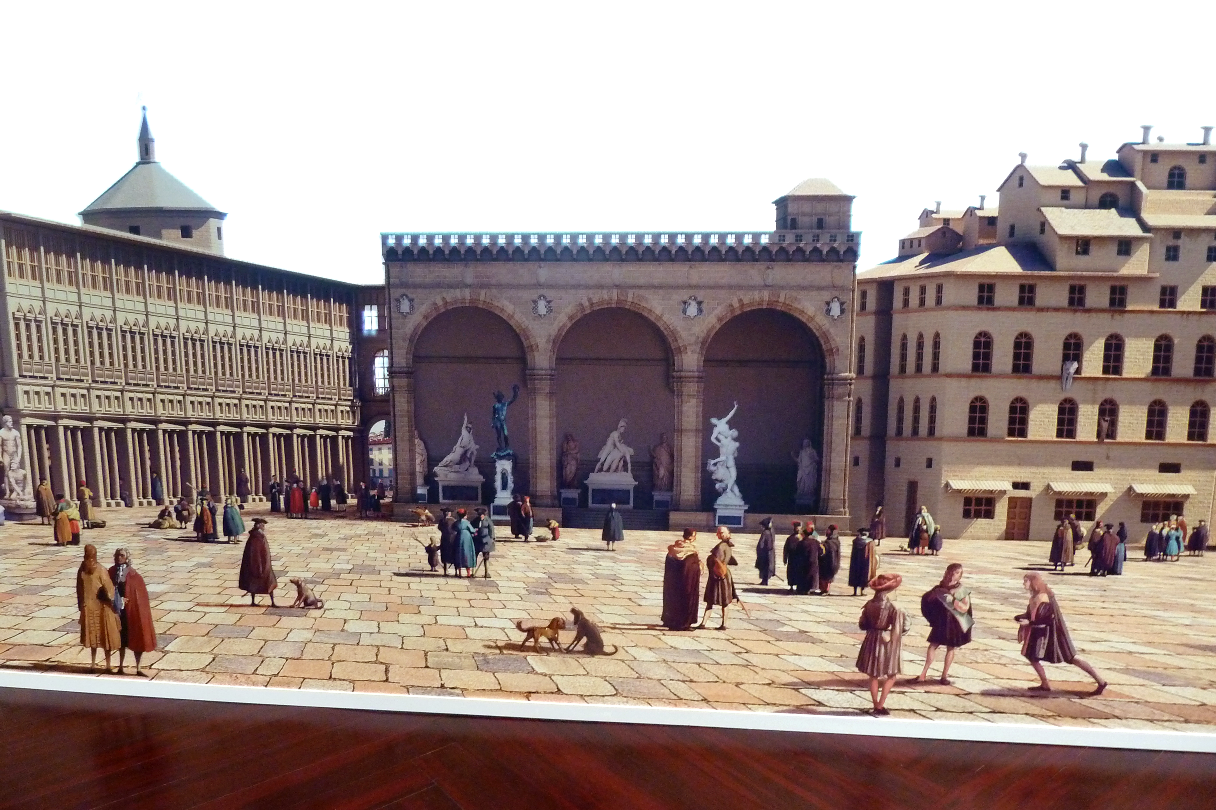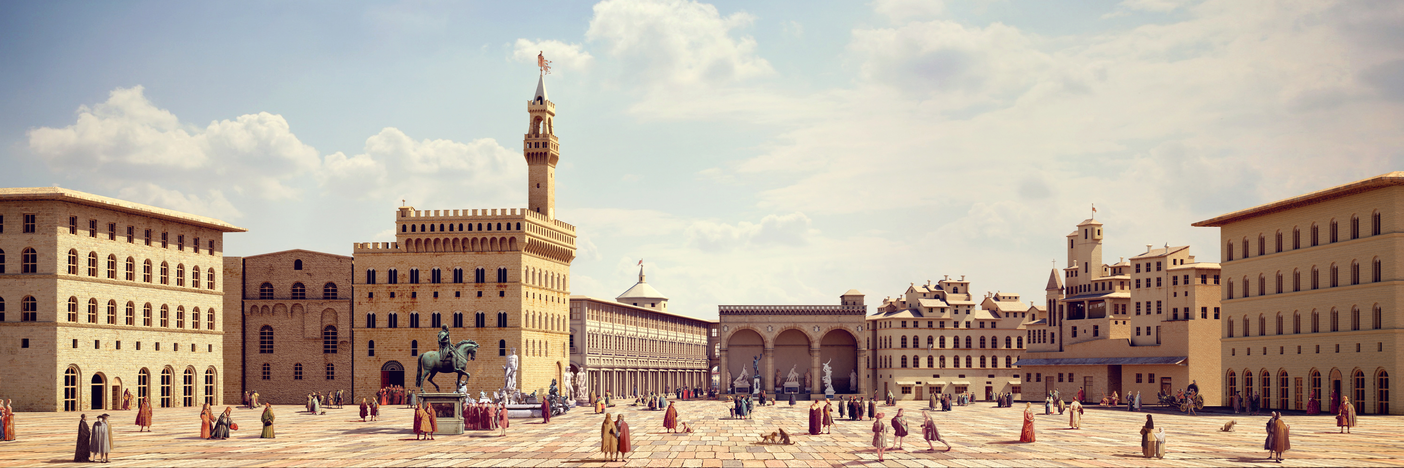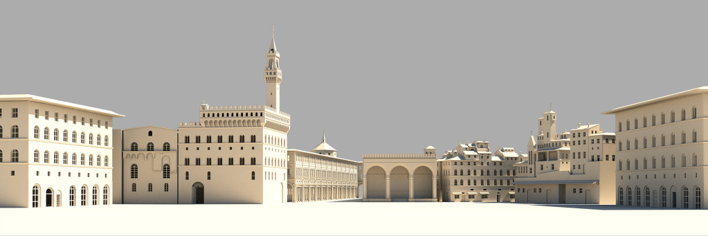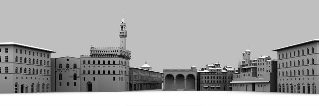 Using Giuseppe Zocchi’s painting The Piazza della Signoria in Florence as a reference, I modelled the scene in 3D, adding painted figures and collage elements to bring the streets to life. A projected sky provided realistic illumination, creating the illusion of stepping into the square.