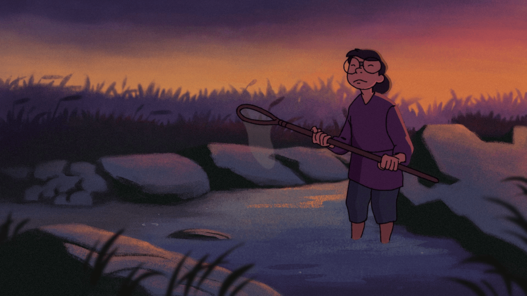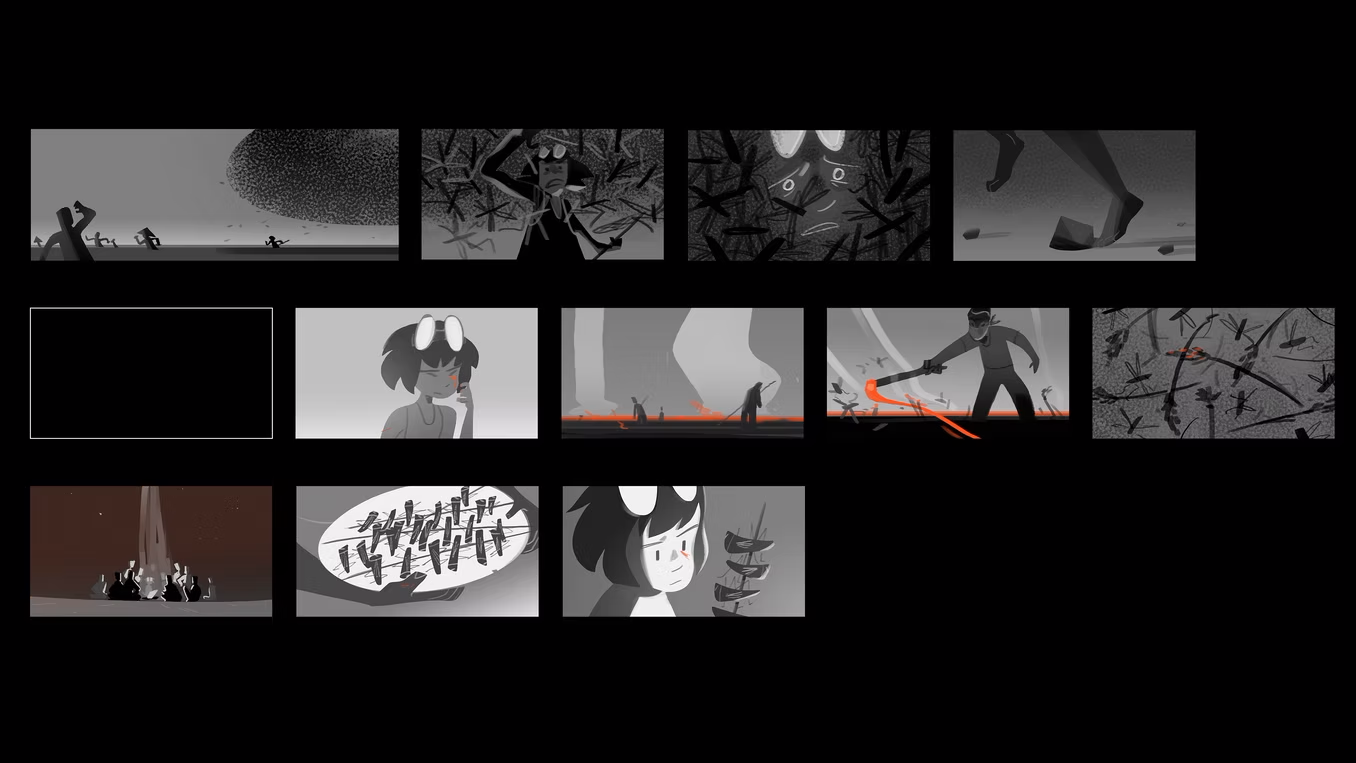 Sarah and I shared character design; she handled set design and painted all the backgrounds, while I drew the storyboards and animated most of the scenes.