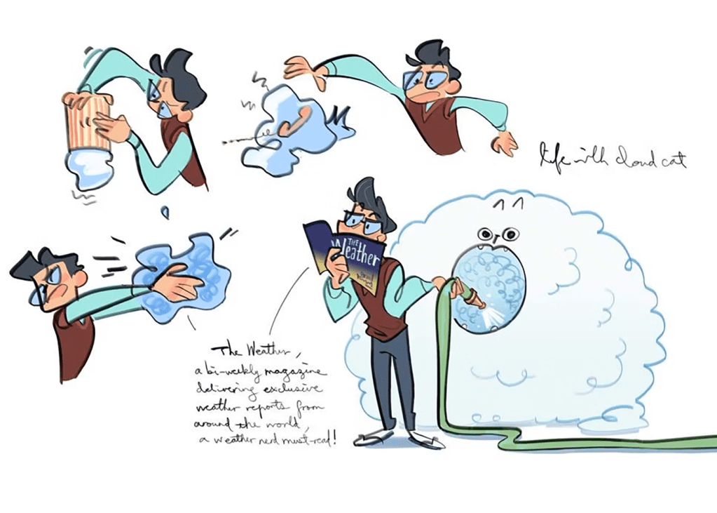 Cloud Cat was a story premise idea I had in 2015 about a passionate and preoccupied weatherman unknowingly adopting a thunderous cat that is actually a cloud.
