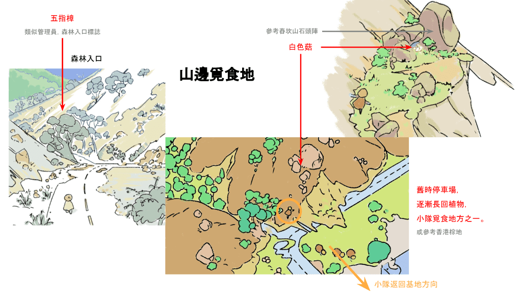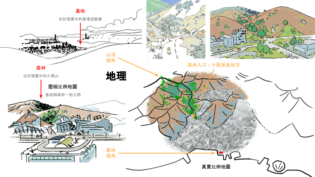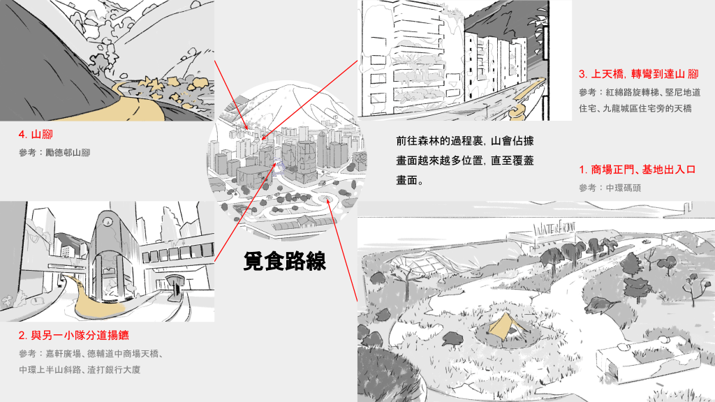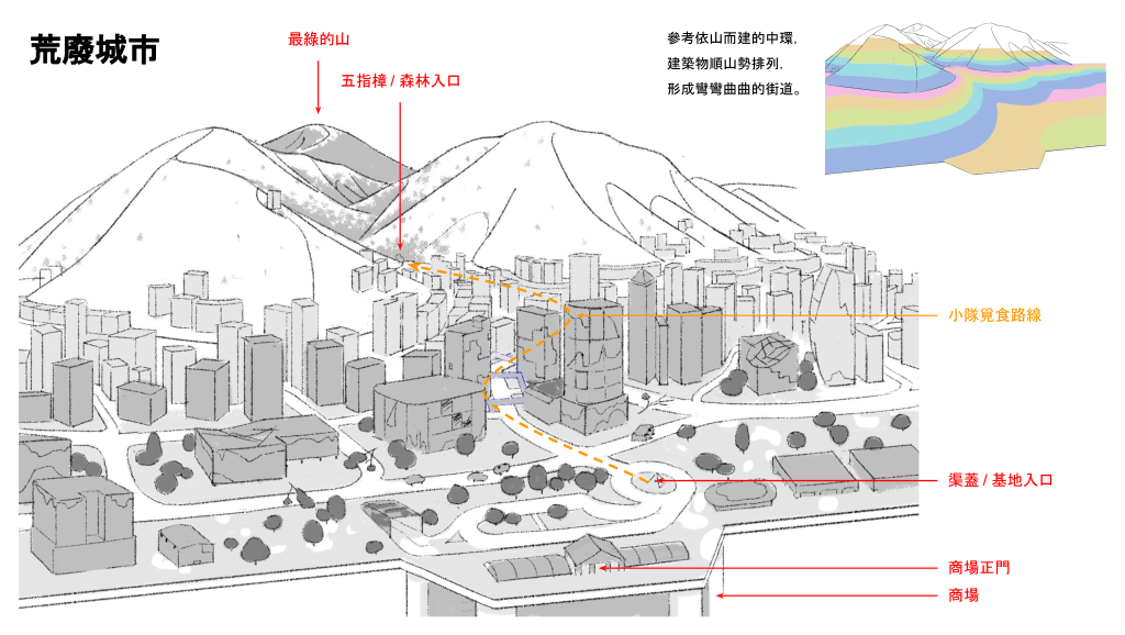 Concept art and geographical exploration in 2022 for Anita So’s story, Steer the Way, which takes place in a post-apocalyptic Hong Kong. A surviving tribe living in an underground shopping mall must navigate through city ruins riddled with dangers to scavenge for valuable resources in the receding forest.