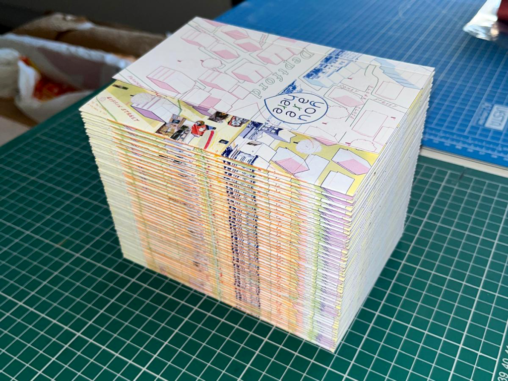 Rather than treating migration as simply leaving and arriving, the project embraces the messy in-betweens of contemporary mobility. Participants mapped their daily routes and shared stories of finding familiarity in unfamiliar places. We developed a zine as both observation record and reflection, while preserving the installation as an archive piece. The work continues at Deptford X Fringe 2025 with a zine-led walk around Deptford.