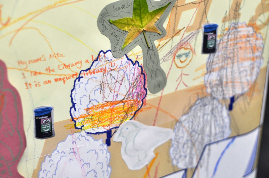 5 × 1.5 m community map with drawing, writing, and collage contributions from library users and workshop participants