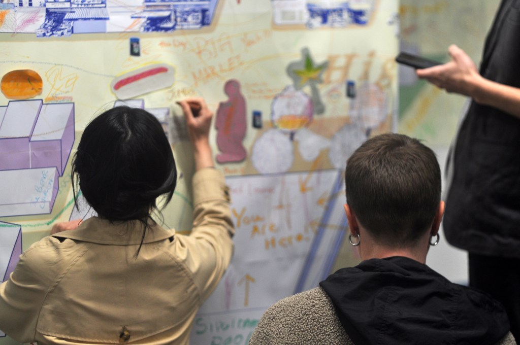 You Are Here, part of Rhizomizing en Route, is an ongoing collaborative mapping project by Stephanie Chung, Sim Orme, and Studio Biped exploring navigation, belonging, and displacement. Through a participatory map installation and walking workshop at Deptford Lounge library in 2024, we brought together long-time residents and newcomers to examine how localities anchor community amid constant change.