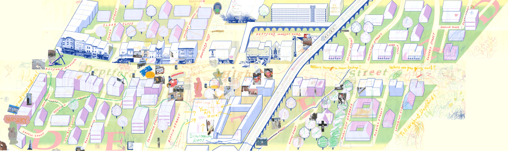 For our project, we set up a large illustrated map of Deptford in the library alongside a basket of colourful crayons. “Really? I can draw anything?” a child asked timidly. Yes! Anything! People soon began marking their daily routes, highlighting favourite spots, while workshop participants added photos from our walk. What emerged was a wonderfully messy collaborative portrait of Deptford, unique to this moment and this particular gathering of people.
